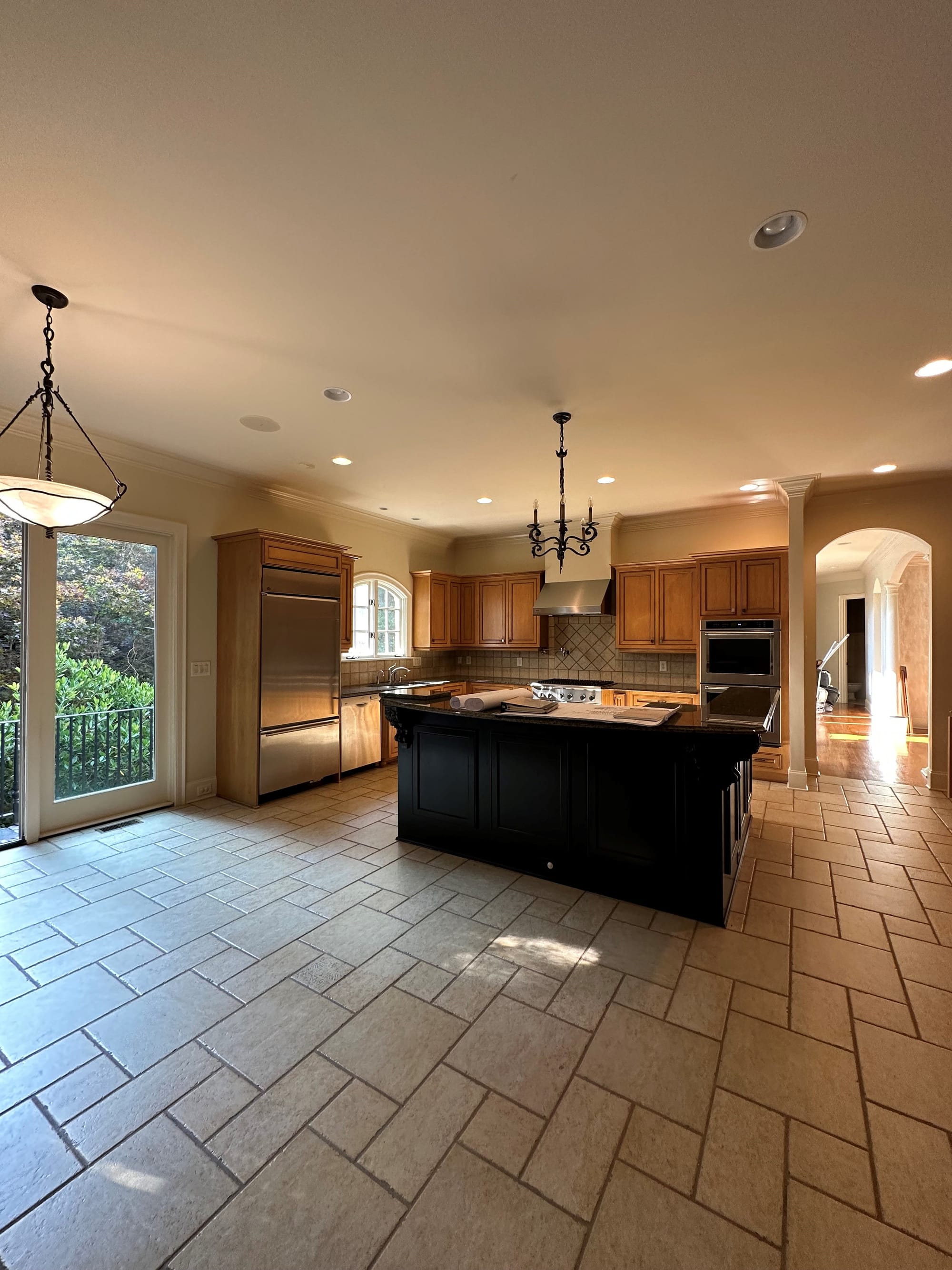 To enhance the flow between the kitchen and family room, pocket doors were added, opening the spaces for greater flexibility. There is now a clear sight line from the kitchen island and dining space into the family room for easier family connection and entertaining.