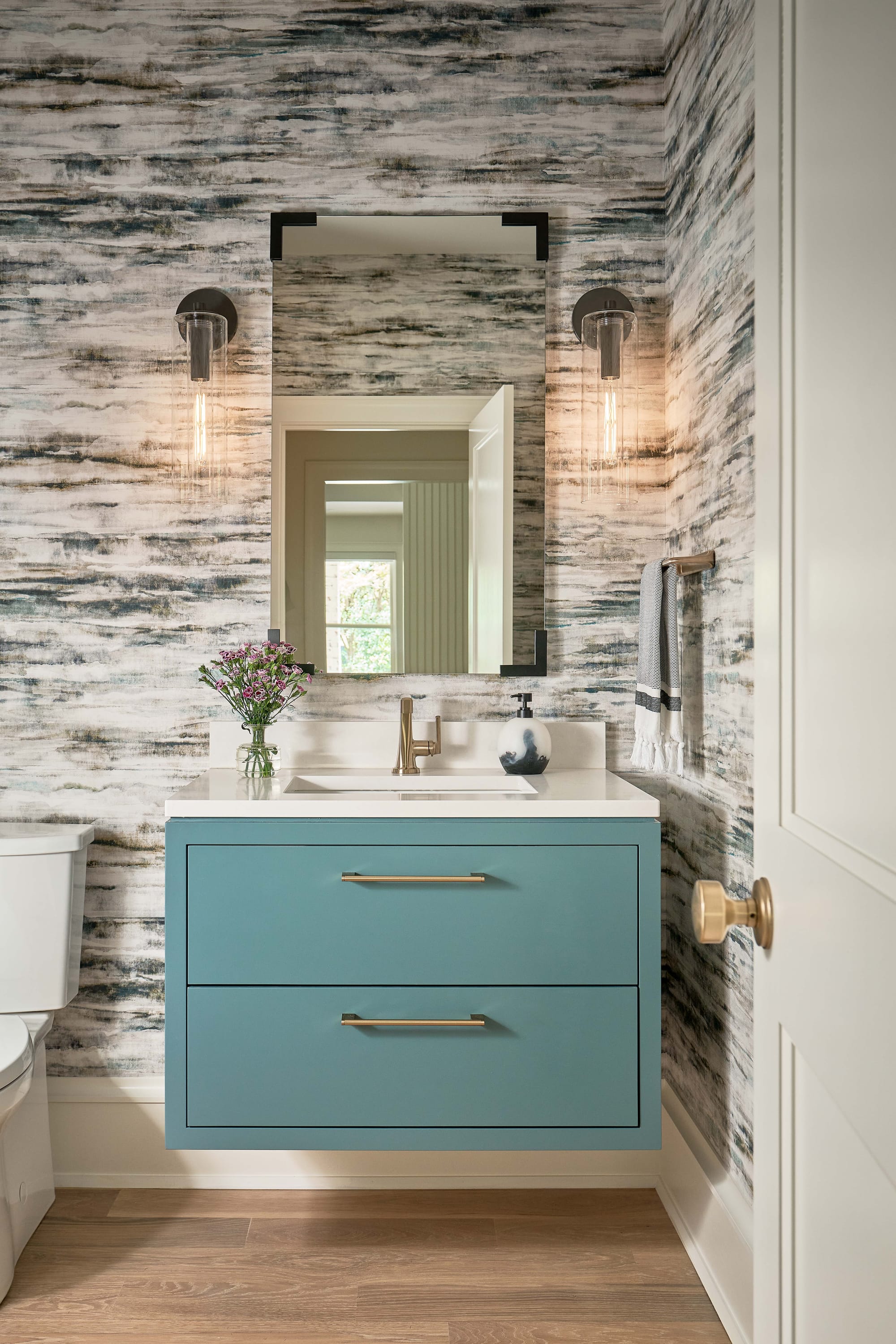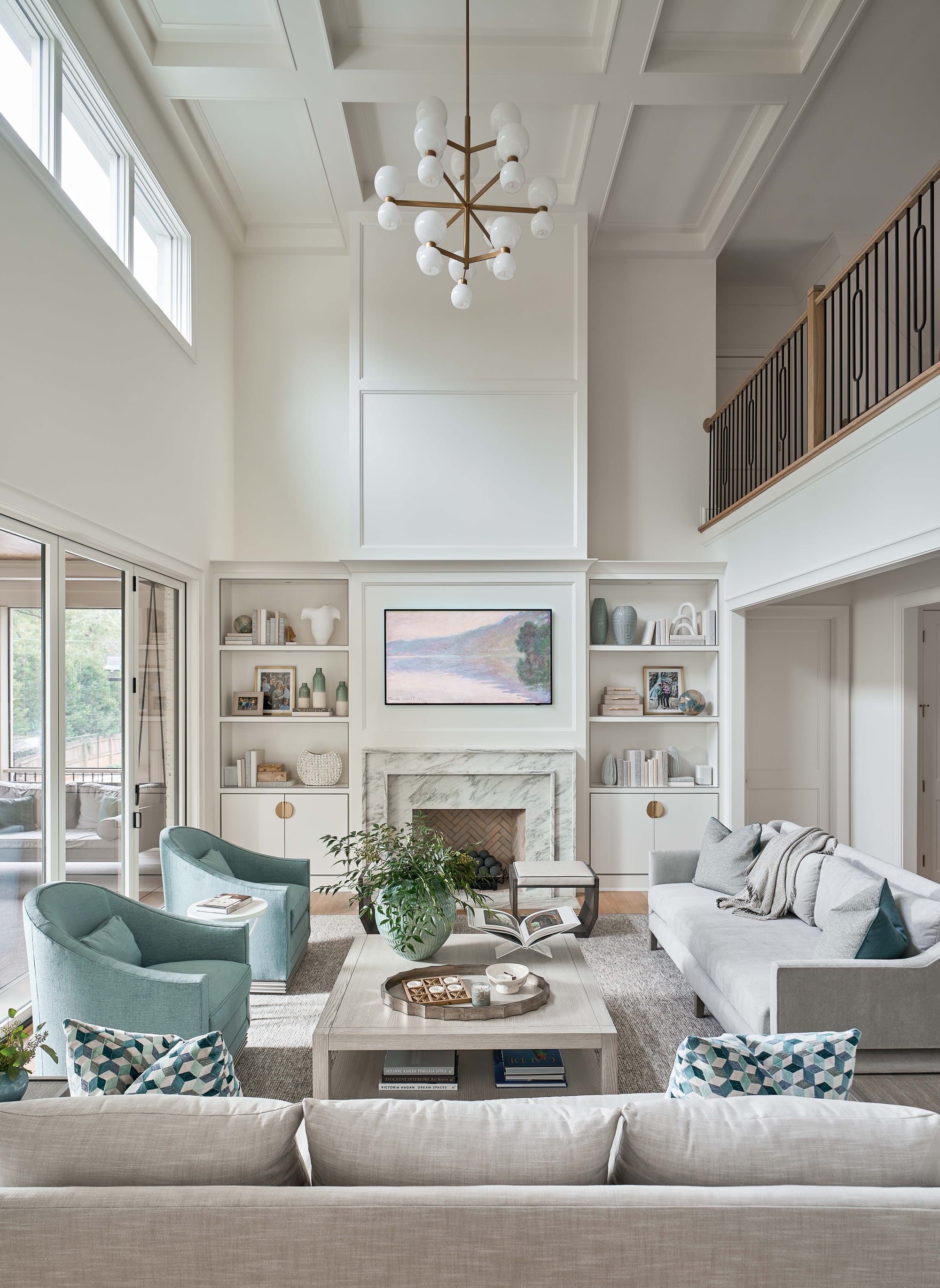 Special details within the home include custom-wrapped cabinetry in the dining room to display the family’s fine china, coffered ceiling, custom hearth and mantel in the family room, curved slat wall in the basement, and textured wallpaper in all bathrooms. A serene color scheme of grays, blues, and whites creates a calm and cohesive atmosphere that ties the entire home together.