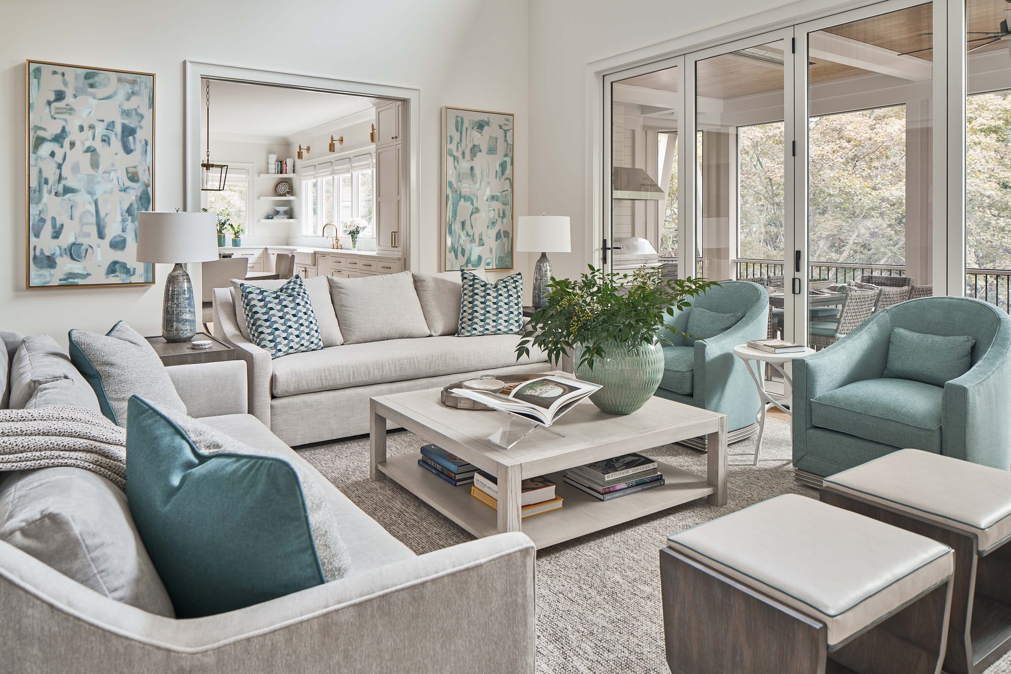 The existing back patio was transformed into a covered porch. 16’ wide accordion doors in the family room seamlessly connect these indoor and outdoor areas.
