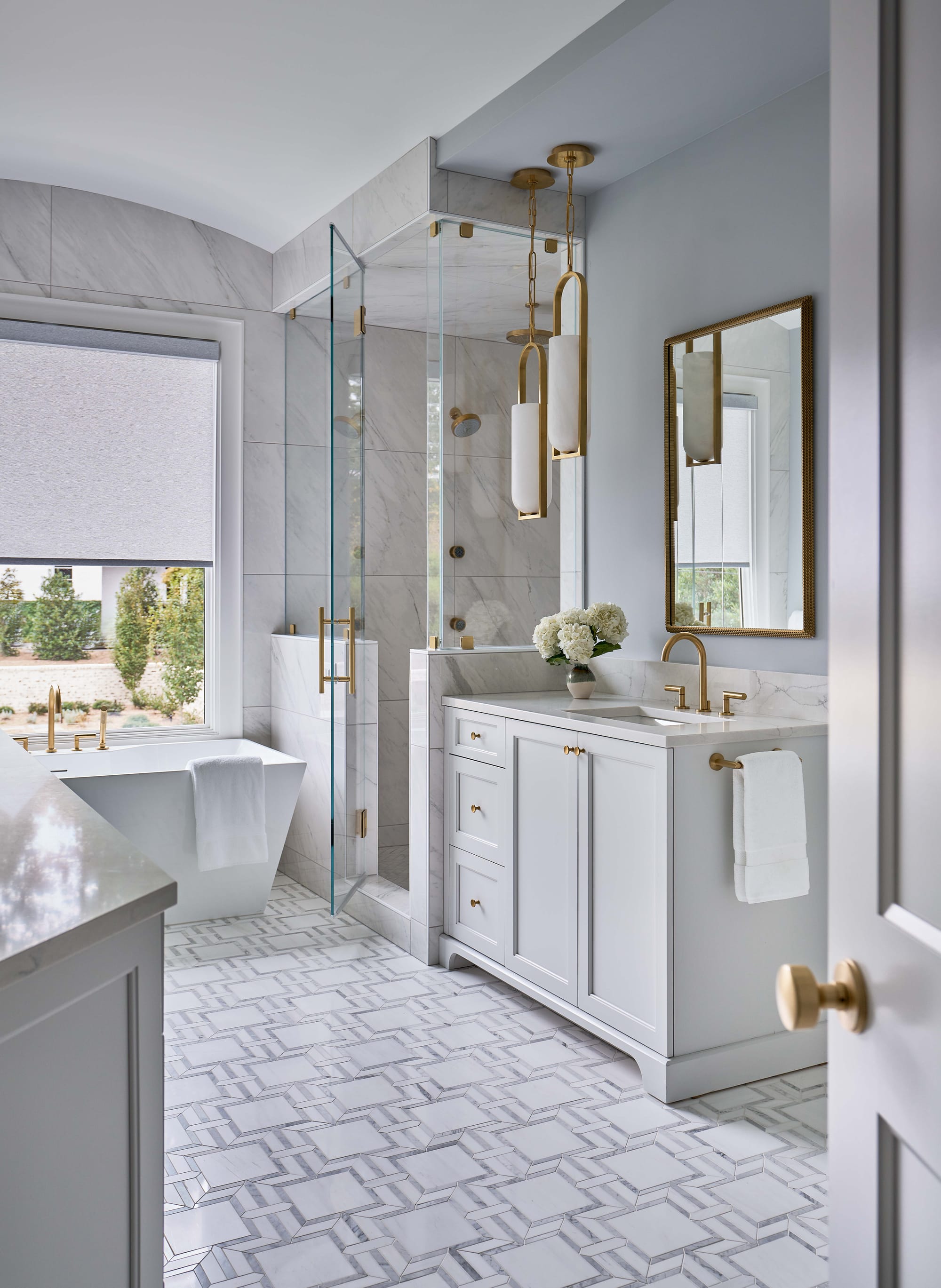 Also on the main level, the layout of the primary suite was redesigned. An existing ½ bath was eliminated to add a second closet to the suite for both his and hers closets. The primary bath now offers a spa-like experience thanks to heated floors, steam shower, freestanding tub with backyard views, and dual vanities.